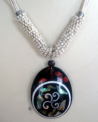 mosaic paua shell and red coral in oval black receine necklace with white bead